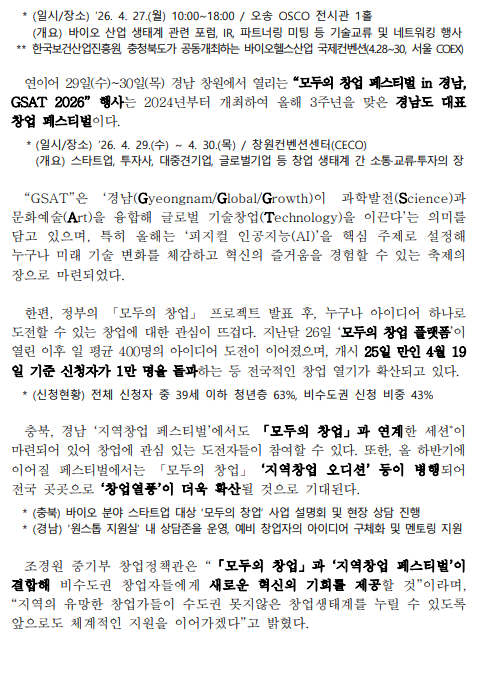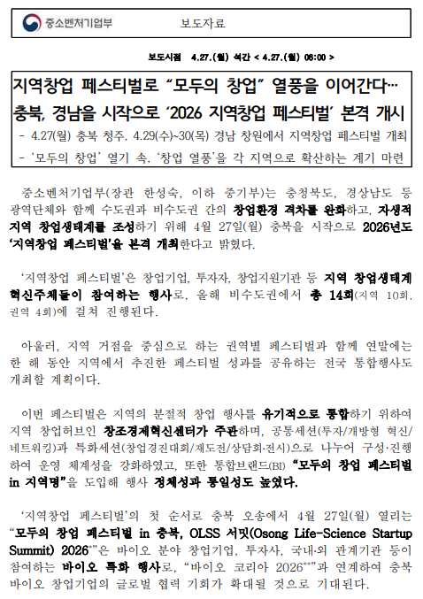 (중기부) 지역창업 페스티벌로 “모두의 창업” 열풍을 이어간다… 충북, 경남을 시작으로 ‘2026 지역창업 페스티벌’ 본격 개시