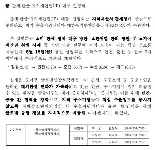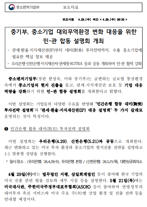 - 260429_중기부,_중소기업_대외무역환경_변화_대응을_위한_민-관_합동_설명회_개최.pdf (494.3K) 0회 다운로드 | DATE : 2026-04-29 10:06:30