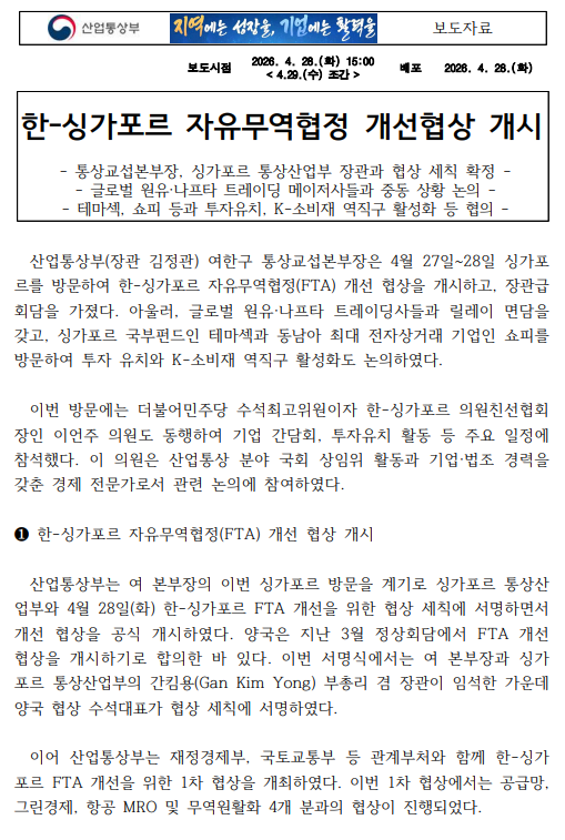 - 042829조간, 28일화 15시엠바고통상협정이행과, 한-싱가포르 자유무역협정 개선협상 개시.pdf (121.3K) 0회 다운로드 | DATE : 2026-04-29 10:13:00